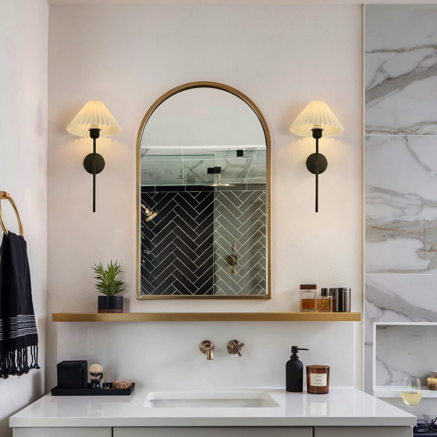 【Wide range of applications】Matte black finish with white pleated fabric shade, perfect as a bathroom vanity light, bedroom wall sconce. Suitable for sofas, mirrors and fireplaces, bedroom cabinets, staircases, etc. The classic fabric shade wall sconce complements the building by directing light upward, downward and outward, spreading it throughout the space and adding brilliance to your home.